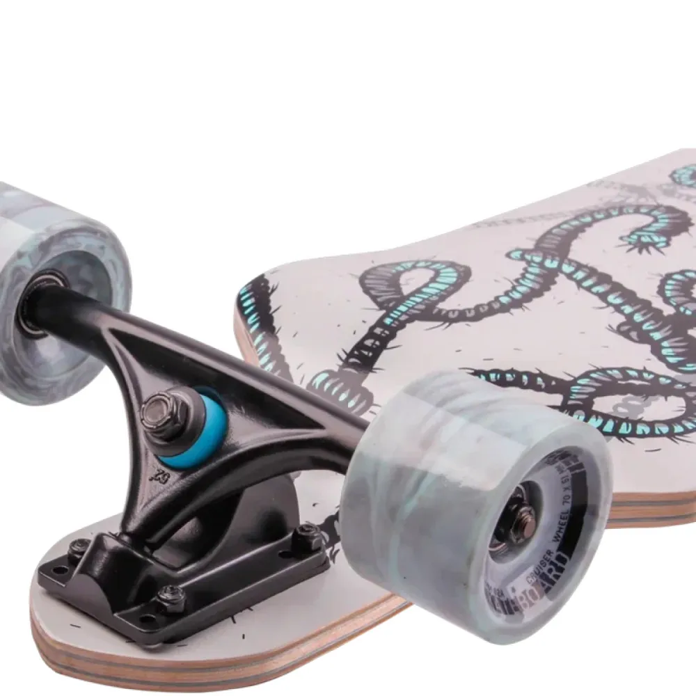 Лонгборд массой 3,7 кг рассчитан на грузоподъемность до 80 кг, что допускает пользование подростками и взрослыми ездоками. Представлен стильным современным дизайном. Материал изготовления модели – дерево+полиуретан+алюминий. Из дерева изготовлена вместительная дека, поверхностная часть которой покрыта нескользящей наждачкой. Колесная часть – полиуретановая, мало стираемая и долговечная. Из алюминия изготовлена подвеска.