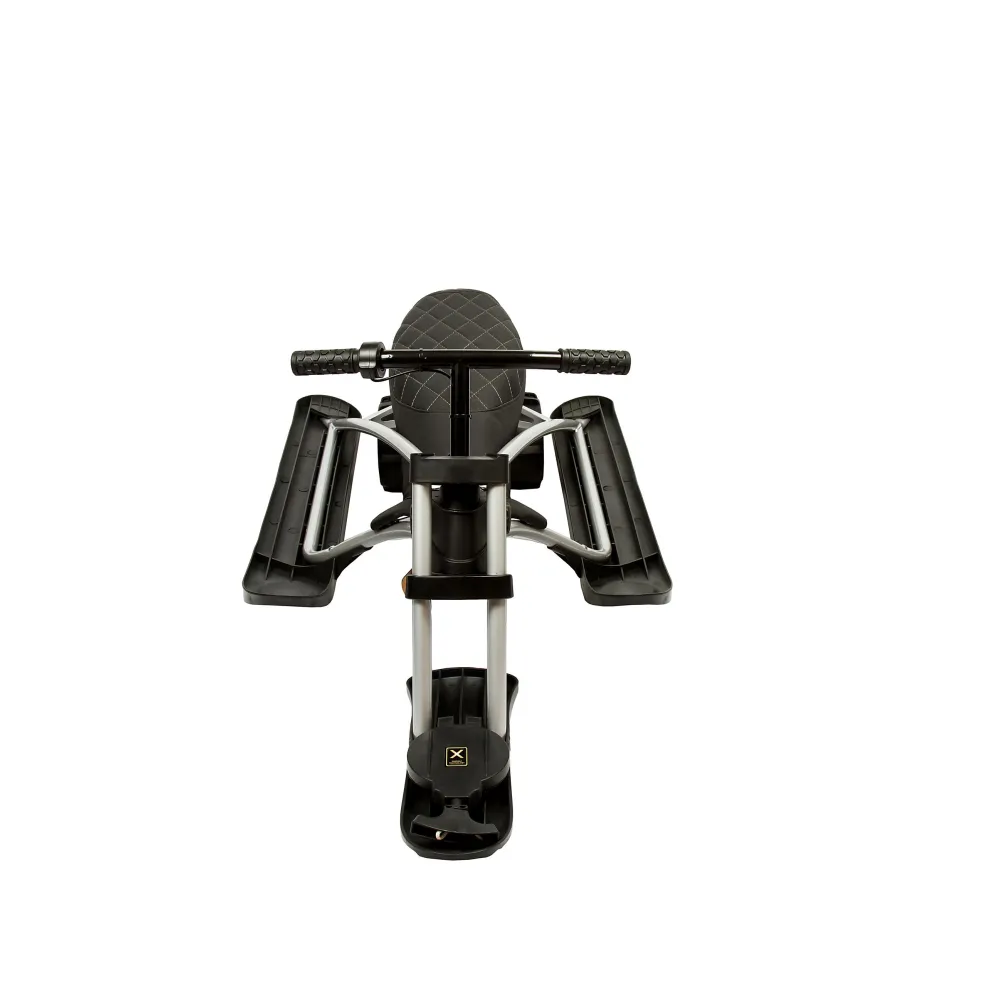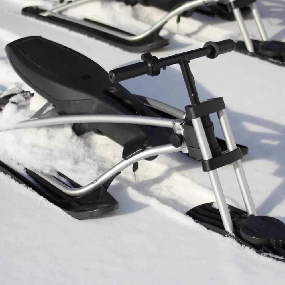 Визуального модный электроснегокат выглядит компактно и эргономично. Общий вес техники сравнительно легкий, составляет 12,7 кг. Конструкция рамы – долговечная и надежная, стальная, не деформируется при эксплуатации в жестких условиях. Большое удобное сиденье покрыто экокожей. Мягкое, повторяет анатомические части тела ездока. Лыжи изготовлены из ударопрочного пластика, гарантируют отличный накат.